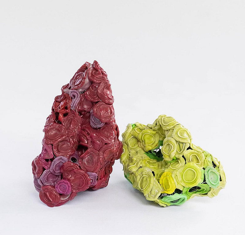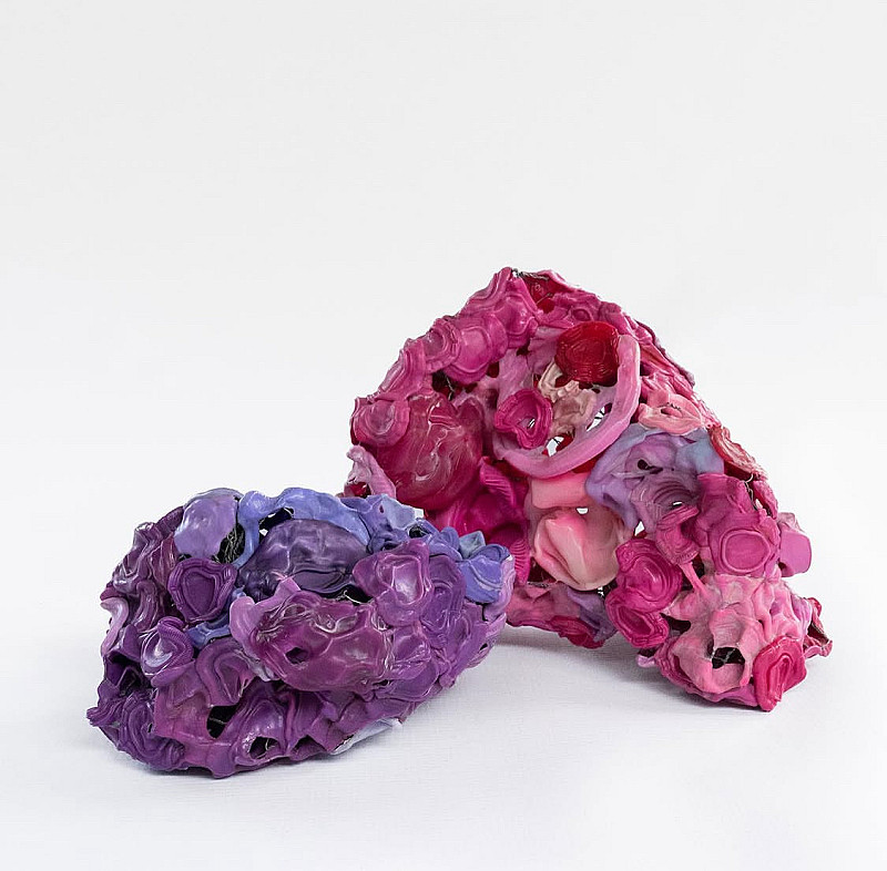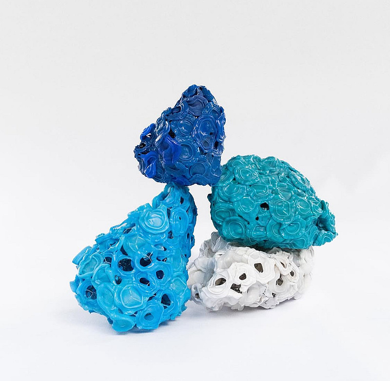 Handfills: A series of small sculptures created from recycled plastic lids and bottle tops, melted onto a wire mesh frame, these works speak to the environmental challenges we face in a way that is bright, engaging and meaningful. The synthetic colourful "rock" sculptures juxtapose the concept of "natural" landscapes with the