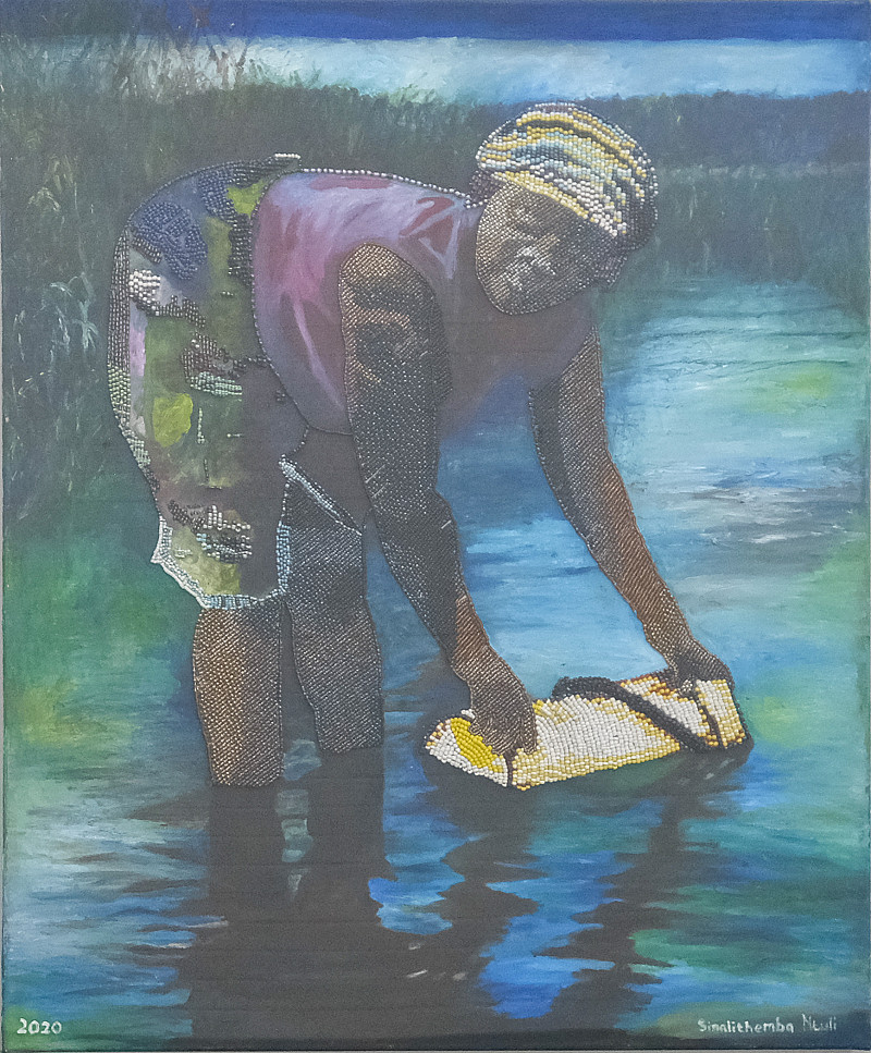 , SINALO NTULI , Beads, oil paint & collage on canvas