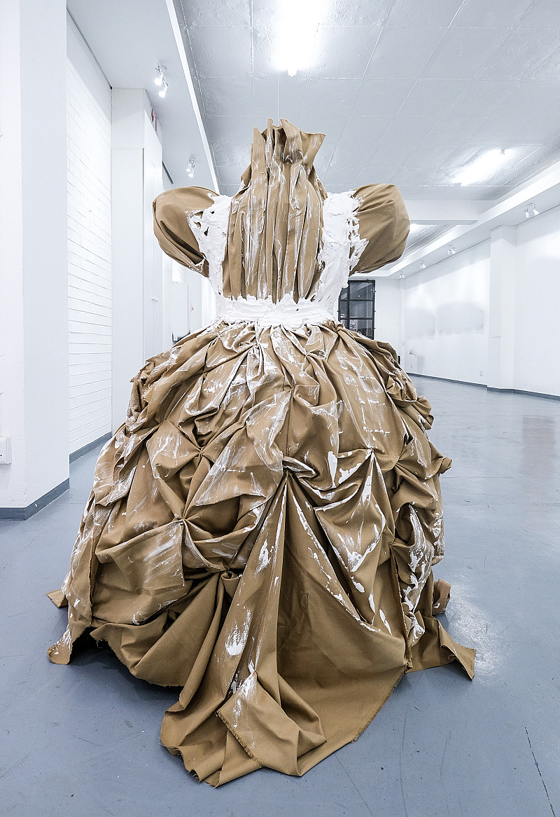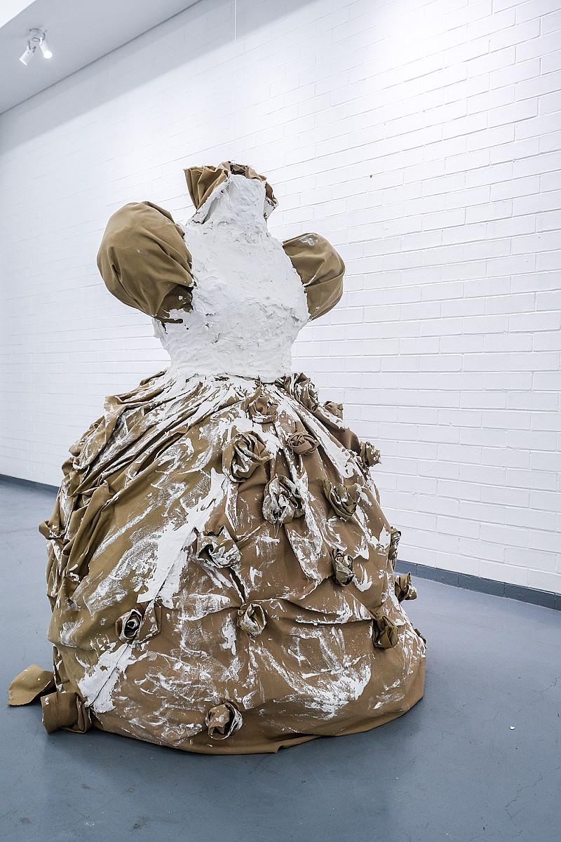 The Mother, grounded in earthy brown, is regal yet unyielding. Encased in a Victorian-inspired gown with rose-like embellishments, this sculpture also incorporates M1 plaster and resin, representing selflessness and the enduring resilience of motherhood. It balances strength with the delicate beauty of life’s sacrifices, spinning endlessly to reflect a mother’s tireless role. Together, these sculptures challenge societal narratives, presenting a layered understanding of womanhood as both vulnerable and indomitable.